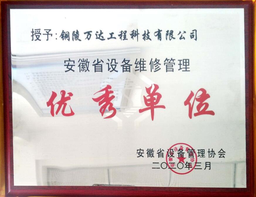 ??? 熱烈祝賀銅陵萬(wàn)達(dá)工程科技有限公司獲得第十一屆“安徽省設(shè)備維修管理優(yōu)秀單位”稱號(hào)。