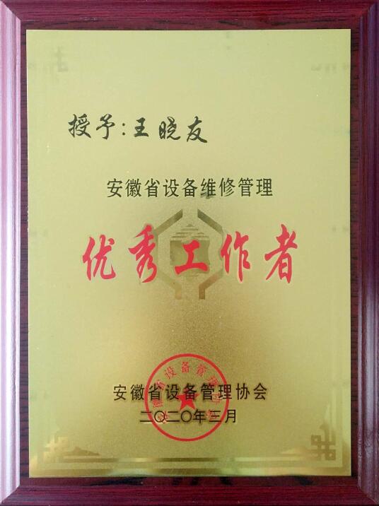 ??? 熱烈祝賀公司總經(jīng)理王曉友獲得“安徽省設(shè)備維修管理優(yōu)秀工作者”稱號(hào)。